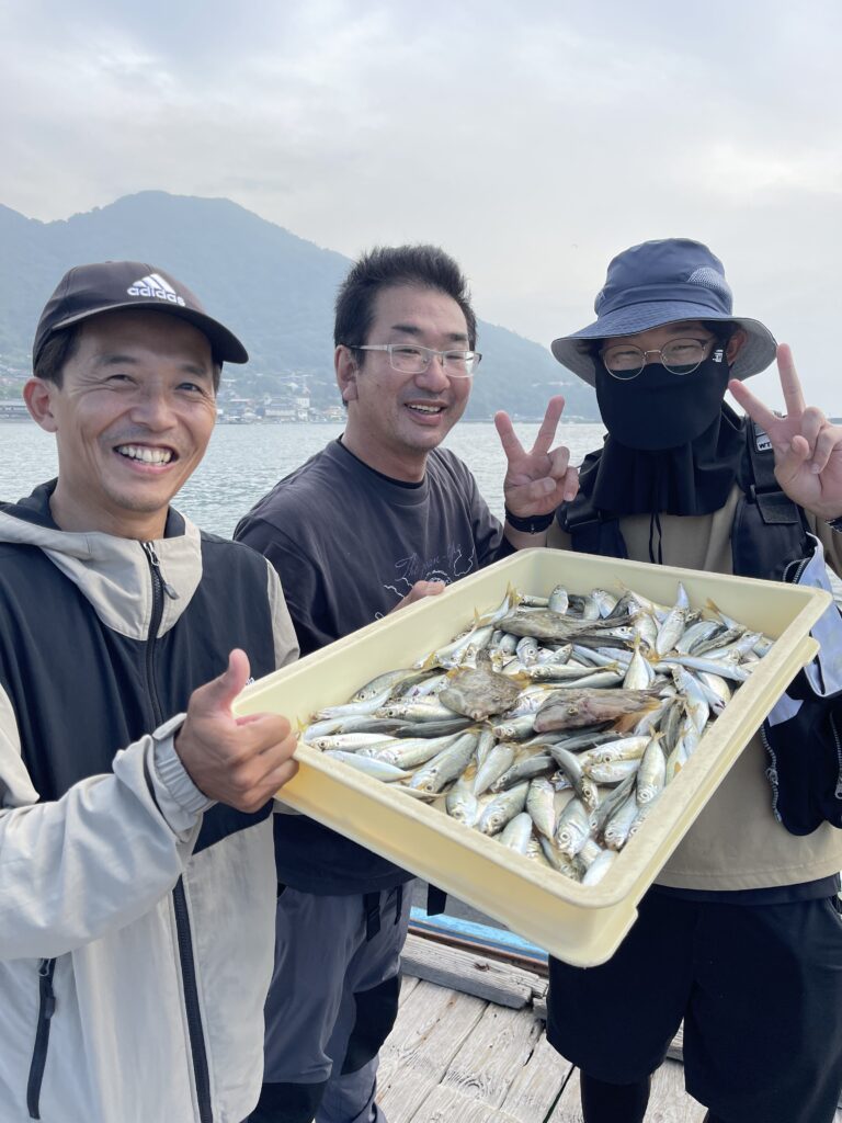 2025.10.12 釣果 一文字 本日の釣果情報_2025.10.12-001 一文字波止、 安松さまグループの釣果です(^^) 目的のアジがたぁーくさん釣れて 予定よりも早いご帰港(^^)v どのくらい満足したのか皆さんの笑顔を見れば容易に想像できますね! また遊びに来てくださいましぃ〜