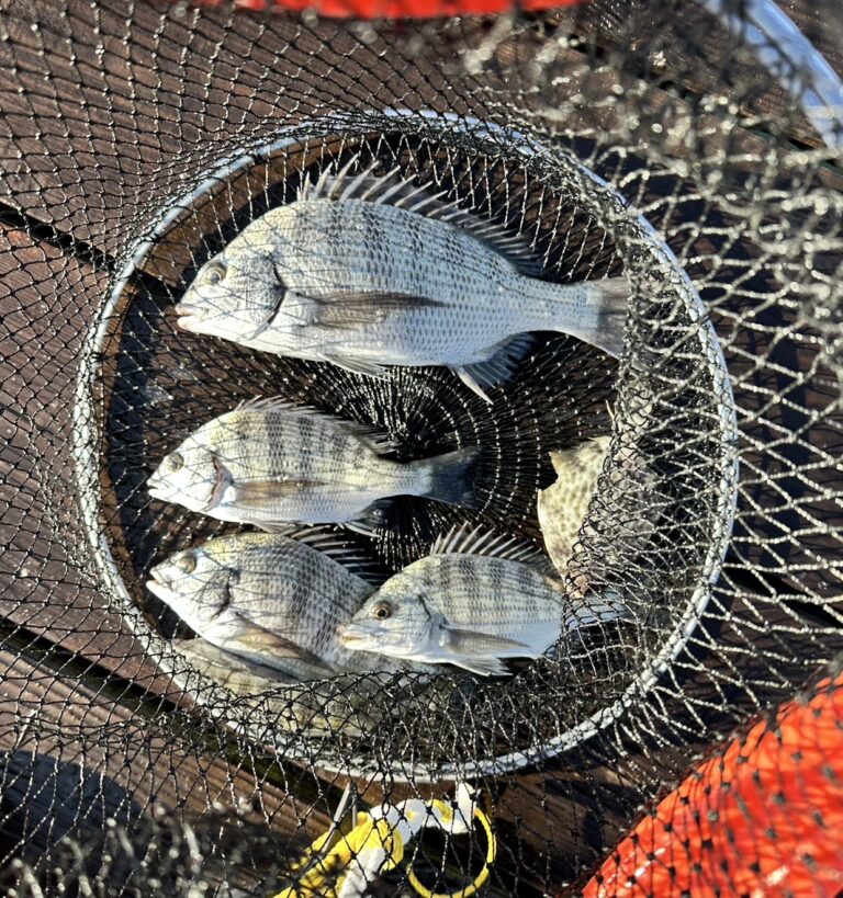 良型が一枚と手のひらより少し大きいサイズ感のチヌ🎶
