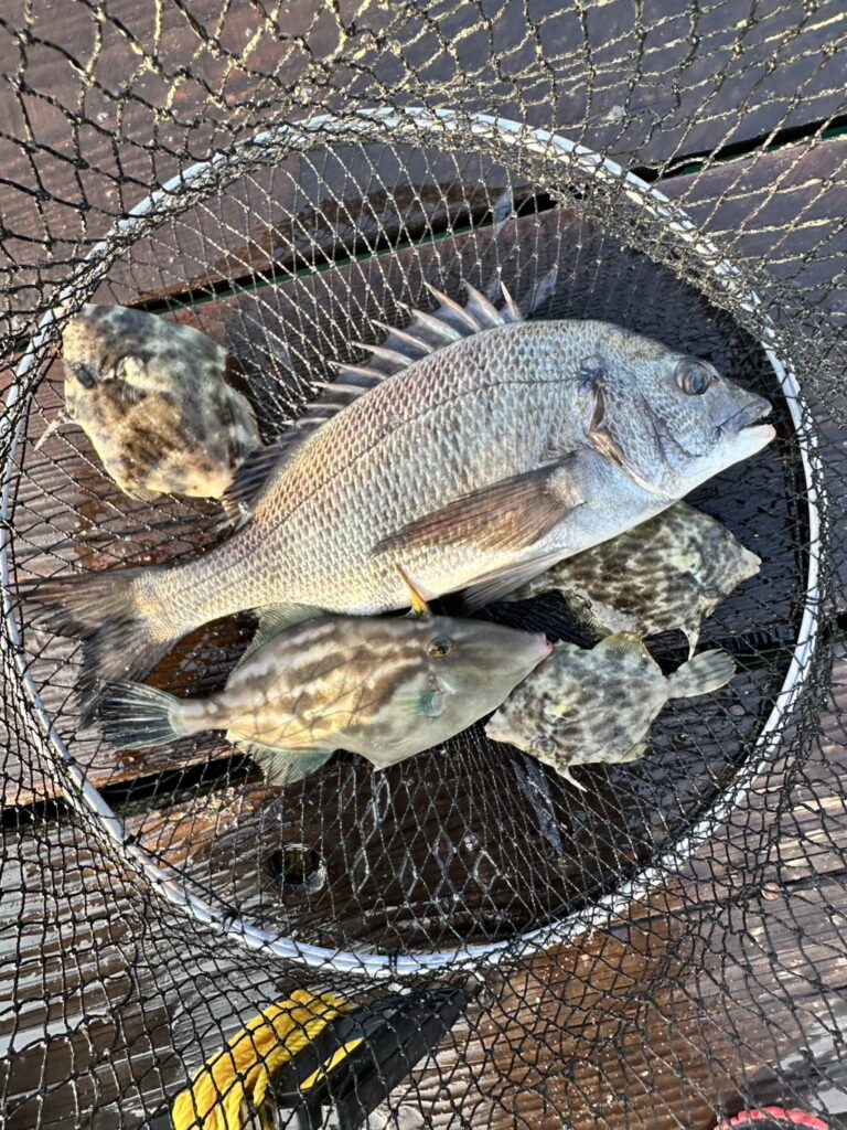 2025.11.26 釣果 釣り筏 本日の釣果情報_2025.11.26 釣り筏、 中島さまの釣果です(˶ᵔ ᵕ ᵔ˶) 本日は、水温が下がったのか食いが渋かったようですが、チヌ37cm (生さなぎ) 、カワハギ、ウマズラハギ(青虫)、ボラその他楽しんでいただけたようです♪ いつもありがとうございます☆