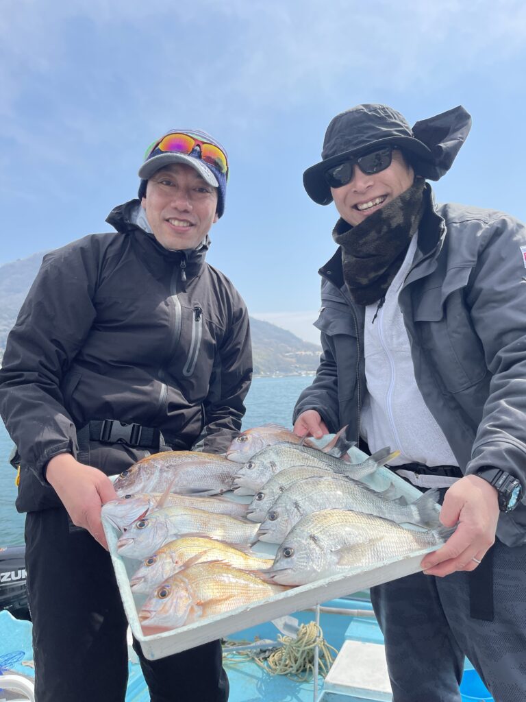 2026.03.20 釣果 貸し舟 本日の釣果_2025.03.20-001 貸し舟、15馬力、 武田さまグループの釣果です(*ˊᗜˋ*) 海エビをご購入いただき 狙うは真鯛( ‘-‘ 鯛 )з 結果は、真鯛とキビレ^ ^ お二人それぞれ仲良く 6枚づつ(๑’ ‘๑)و✧グッ! やっぱり活きエビがいいわぁ〜とテンヤのアタリに大満足♪ いつもありがとうございます⭐︎