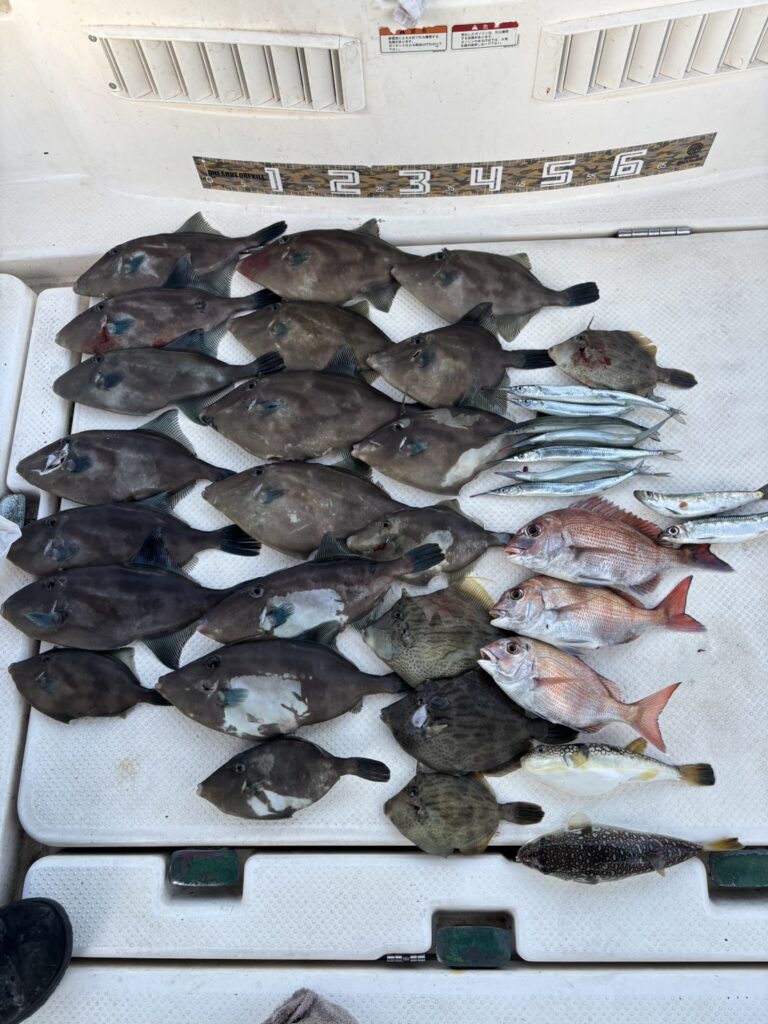 本命のウマヅラハギ爆釣に、カワハギ、サヨリに真鯛、フグと、とんでもない爆釣!!